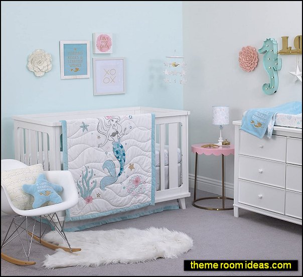 A matching dust ruffle in aqua and white with touches of pink completes the set. This set coordinates with a complete collection of Ariel Sea Princess nursery decor and accessories.